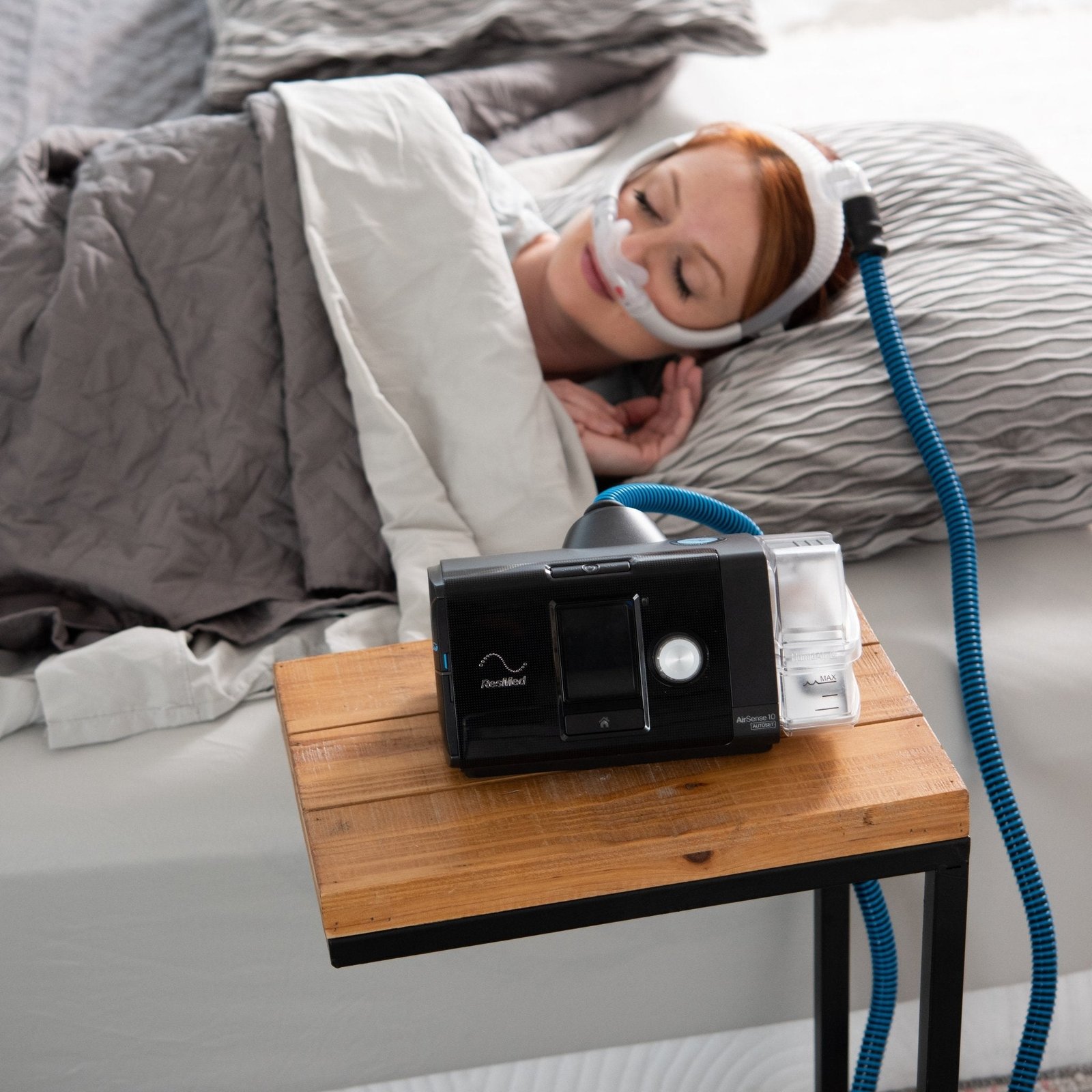 The CPAP tube connects at the top of your head instead of in front of your nose, allowing unrestricted movement during sleep.