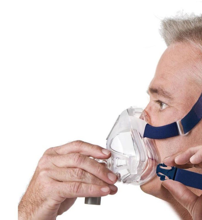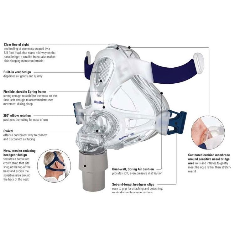 This mask is effective only when used with a CPAP/BiLevel machine. ResMed’s Quattro™ FX Full Face Mask is the next evolution of the trusted Mirage Quattro. Engineered for comfort and flexibility, this mask features a compact design with minimal facial contact — ideal for side sleepers and anyone who prefers a clear field of vision while reading or watching TV in bed.